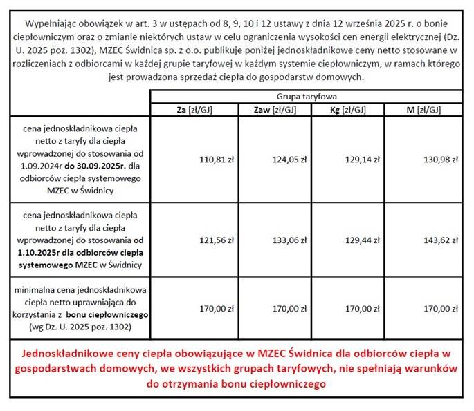 Informujemy, że zgodnie z art. 3 " Ustawy o bonie ciepłowniczym oraz o zmianie niektórych ustaw w celu ograniczenia wysokości cen energii elektrycznej" ( Dz.U. z 2025r. poz.1302), Miejski Zakład Energetyki Cieplnej Sp. z o.o. w Świdnicy opublikował jednostkowe ceny ciepła netto ( tabela poniżej).